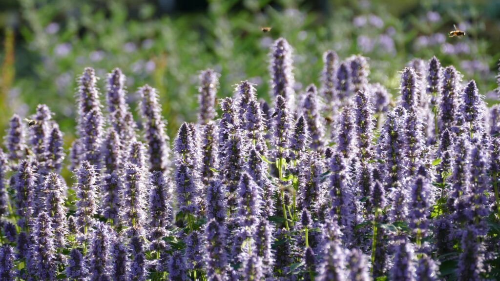 Grundsätzlich planen wir mit unterschiedlichen Blütenformen wie hier z.B. kerzen- (Königskerzen und Duftnesseln), kugel- (Zierlauch und Kugeldisteln) sowie doldenförmigen (Schafgarbe und Seidenpflanze) Blütenständen. Außerdem wurden verschiedene Blattfarben und -formen verwendet. Das sorgt für Abwechslung und macht das Gesamtbild spannender für den Betrachter.
