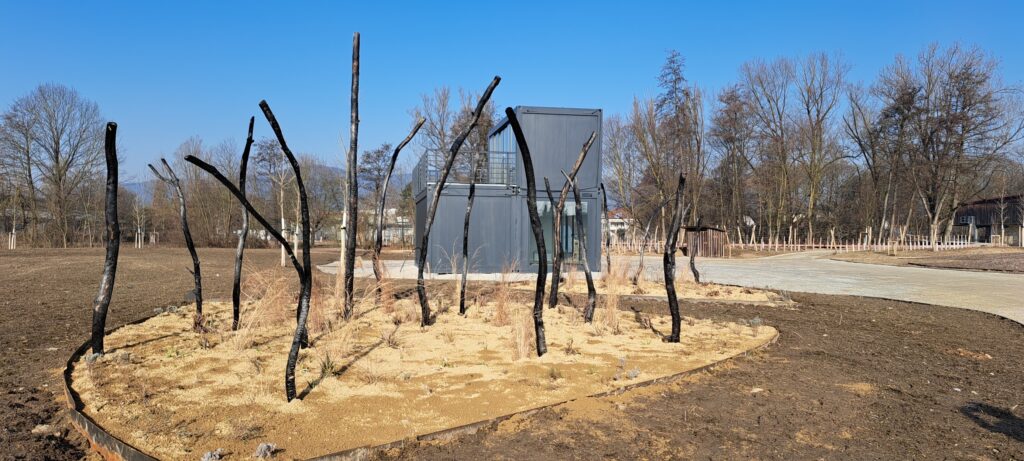 Zudem möchte man, dass der Boden durchlässig und mineralisch bleibt. Bei der Verwendung von organischen Mulchmaterialien entsteht mit der Zeit durch die Verrottung Humus. Ganz nebenbei ist es ein schöner Kontrast zu den verkohlten Stämmen.