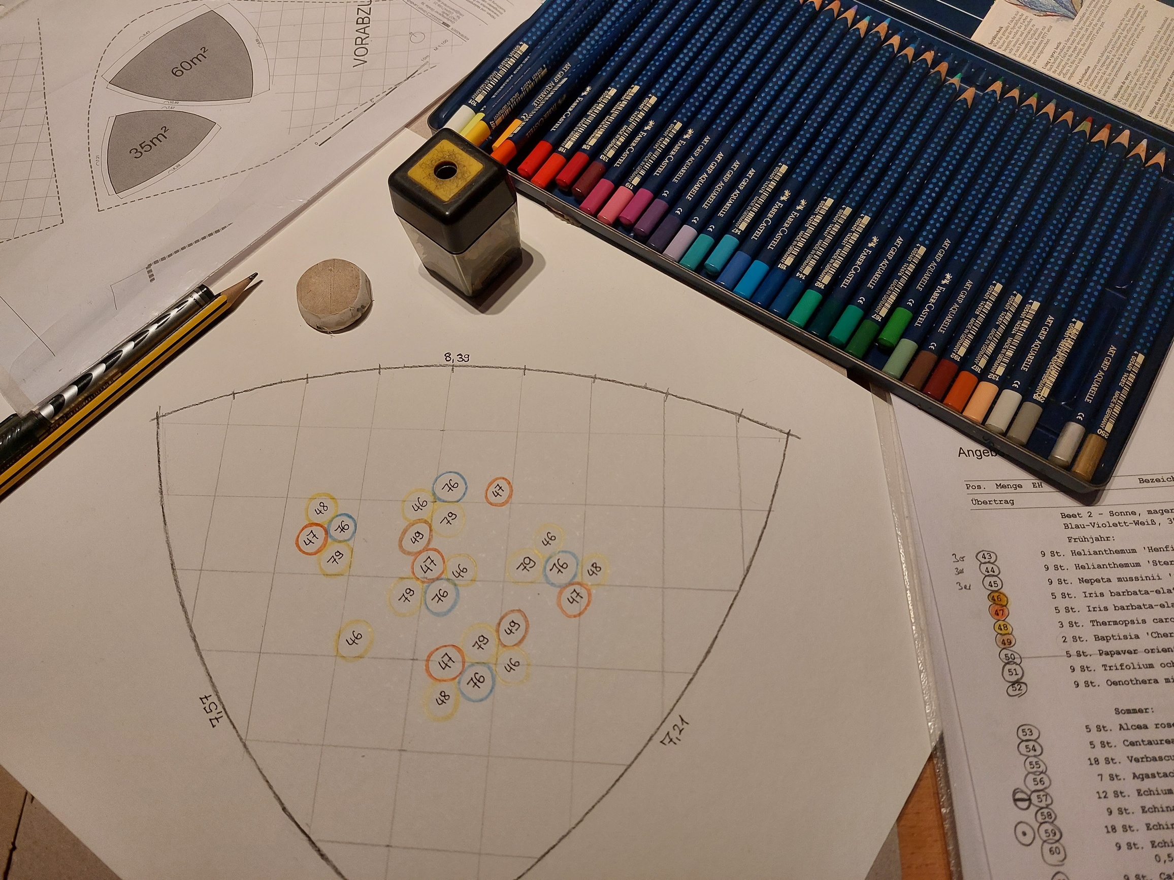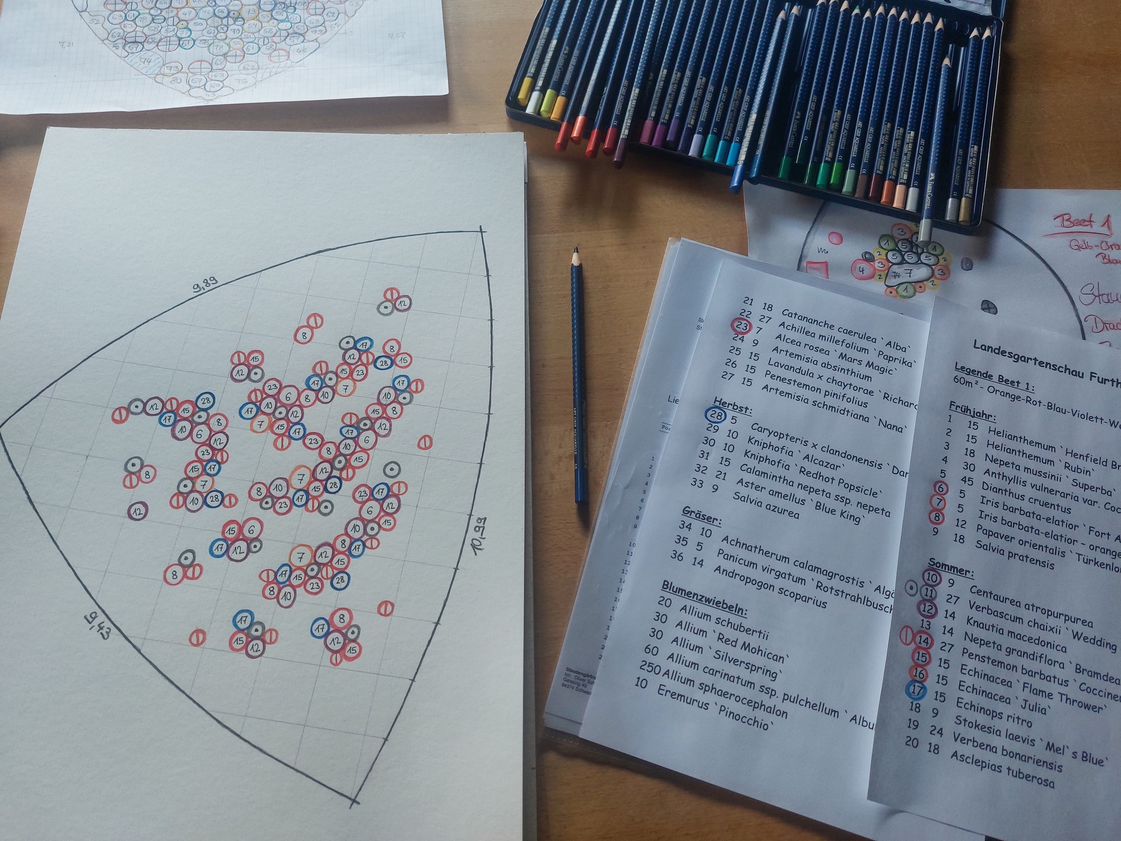 Aufgrund der knappen Vorlaufzeit wussten wir, dass wir Einiges anders planen mussten. Die Stückzahl pro Quadratmeter wurde deutlich erhöht und einige Stauden durften frühzeitig in größeren Töpfen Vorsprung „rauswachsen“. Normalerweise benötigt ein Staudenbeet 2-3 Jahre, bis es vollständig entwickelt ist. Wir hatten aber nur 6 Monate bis zum Pflanztermin im Oktober 2024. Zum Start der Gartenschau sollte der Besucher nicht den Eindruck eines frisch gepflanzten Staudenbeetes bekommen, sondern ein üppig gefülltes Blütenmeer.